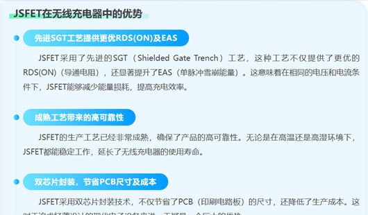 JSFET( Junction Field-Effect Transistor)是一种场效应晶体管,广泛应用于无线充电器中。它通过控制电流的流动来实现高效的能量传输。 MOSFET(金属氧化物半导体场效应晶体管)在无线充电技术中扮演着至关重要的角色。无线充电系统通常包括发射端(充电器)和接收端(设备),而 MOSFET 在这两个部分中都有广泛应用。 JMSL0315ARD 凭借其紧凑型设计、优异的…