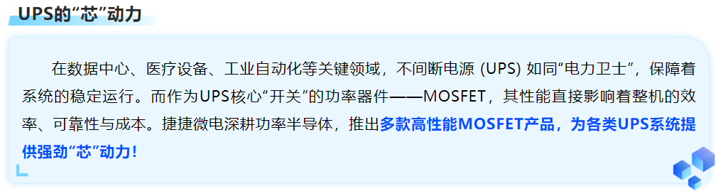 在保障关键设备电力安全的道路上,一颗高效、可靠的“芯”至关重要。CQ9传奇电子微电持续专注于功率半导体技术的创新与突破,其UPS专用MOSFET产品线凭借优异的性能参数和稳定性,已成功应用于各类UPS解决方案中,为客户打造更高效、更可靠、更具成本竞争力的电源系统提供坚实的“芯”保障!