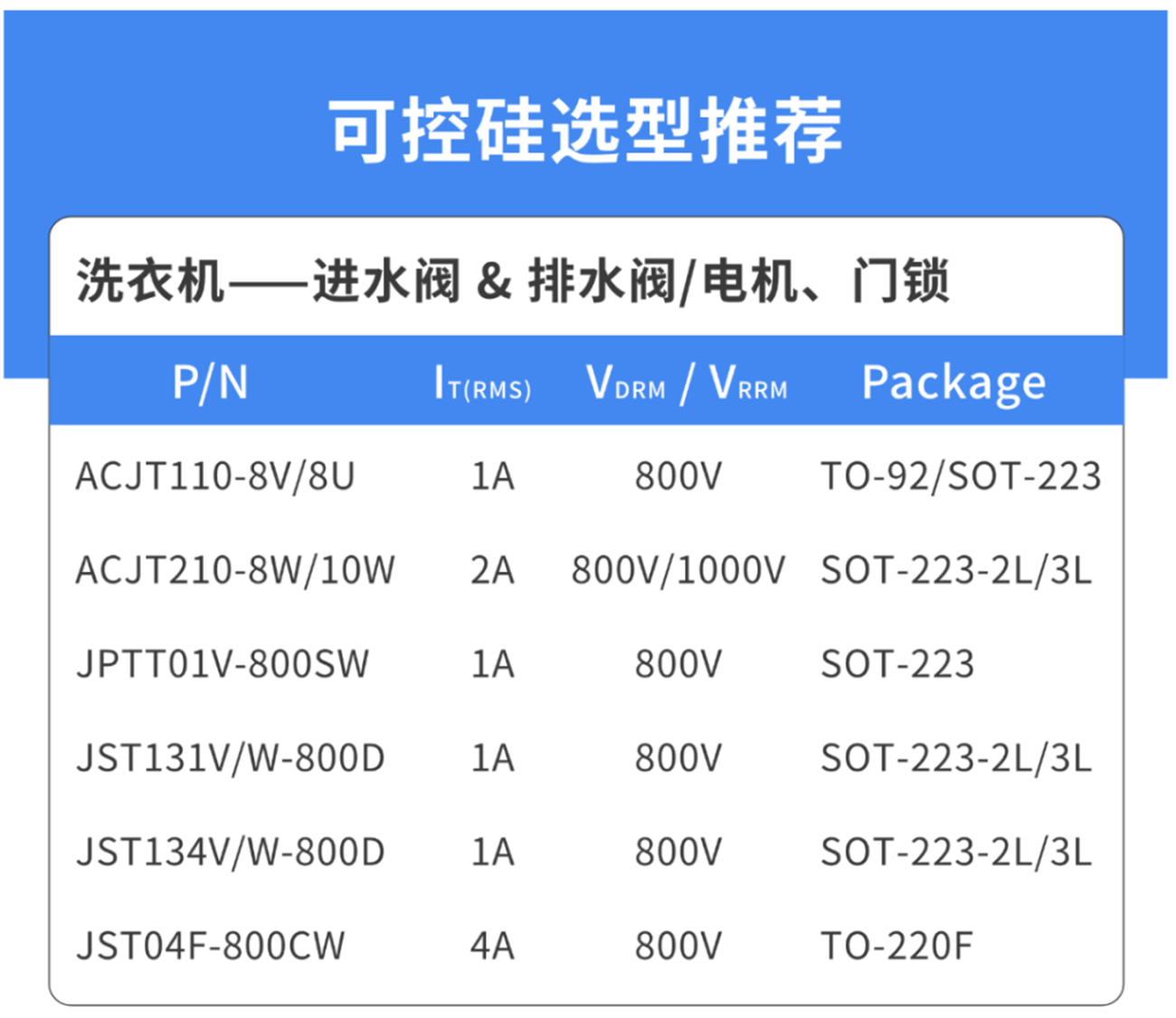 在洗衣机的电路系统中,可控硅是关键元件。CQ9传奇电子微电针对洗衣机不同控制负载的需求,提供了丰富的可控硅产品选择。在进水阀和排水阀(电机或泵)领域,JPTT01V – 800SW、JST131、JST134、ACJT210、JST04 等型号可控硅,以 1A、2A或4A 的电流和 800V 的耐压值,配合 TO – 92、SOT – 223、TO-220F 等封装形式,稳定控制水流进出。在电机正反转控制方面,T835H-8F、JST12X – 800CW 等 8A – 12A 大电流可控硅,确保电机强劲运转,适应各种电机功率。在滚筒洗衣机的门锁开关和加热环节,同样有适配的可控硅产品,保障洗衣过程的安全与高效。类比同行可控硅,CQ9传奇电子微电的可控硅抗雷击性能表现卓越,优于部分竞品,有效提升了洗衣机的稳定性和耐用性。