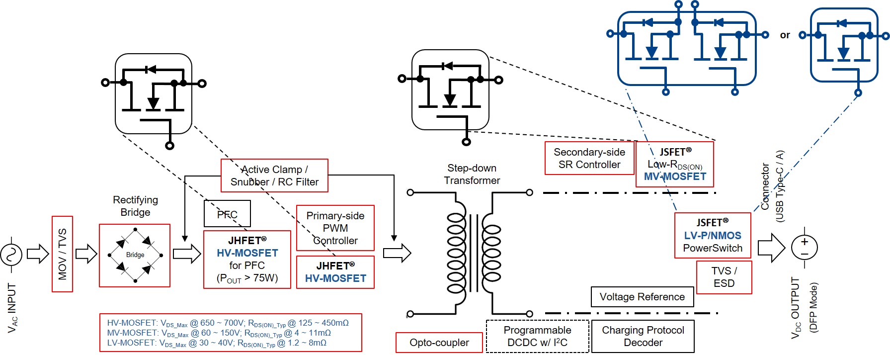 输出功率从 18W 到 100W (甚至 120W 或更大) 、支持快充协议 (USB PD3.0/3.1, USB BC1.2, UFCS T/TAF 083-2022, Qualcomm QCxx, MediaTek PExxx、Huawei S/FCP, Oppo D/FCP, Samsung AFC, Apple 2.4A, …)、配置一个或多个 USB Type-A 及 Type-C 输出接口的快充充电器日益普遍。它们可以一物多用,同时为智能手机、平板、智能手表及笔记本电脑等万物互联数字化终端里面的锂电池快速充电。采用第三代半导体功率器件(氮化镓 D/E-mode HEMT)的设计,体积小巧以及使用时温度不会烫手,由于因近年多家世界排名前列的智能手机 OEM 不把充电器随着新款手机一起标配而形成曲棍球棒效应,使得这类小巧的快充充电器成为市场主流。 市场上的快充充电器,常用的交直流电源转換拓扑是 Flyback 及 LLC。Flyback 拓扑常见于功率比较小的设计,LLC 拓扑则常见于功率较大及对交直流电源转換效率要求较高的设计。因为 BOM 相对 LLC 拓扑比较简单,ACF-Flyback 拓扑也开始被中/小功率的设计采用,特別是初级使用高压氮化镓 HEMT 的设计。无论是那种拓扑,快充充电器的內部结构示意图大概如上: 针对快充充电器的成用,CQ9传奇电子微电 能提供完整的分立器件解决方案。比如,AC 输入端防浪涌的 MOV、TVS、钳制变压器漏感而对原边的高压 MOSFETs VDS_Max 产生过压的快恢复整流管、原边 PFC (75W 以上的设计) 和匹配 PWM 的高压 MOSFET、副边同步整流中/低压 MOSFETs、USB Type-A 及Type-C 端口的低压 MOSFETs 及 ESD 保护等。